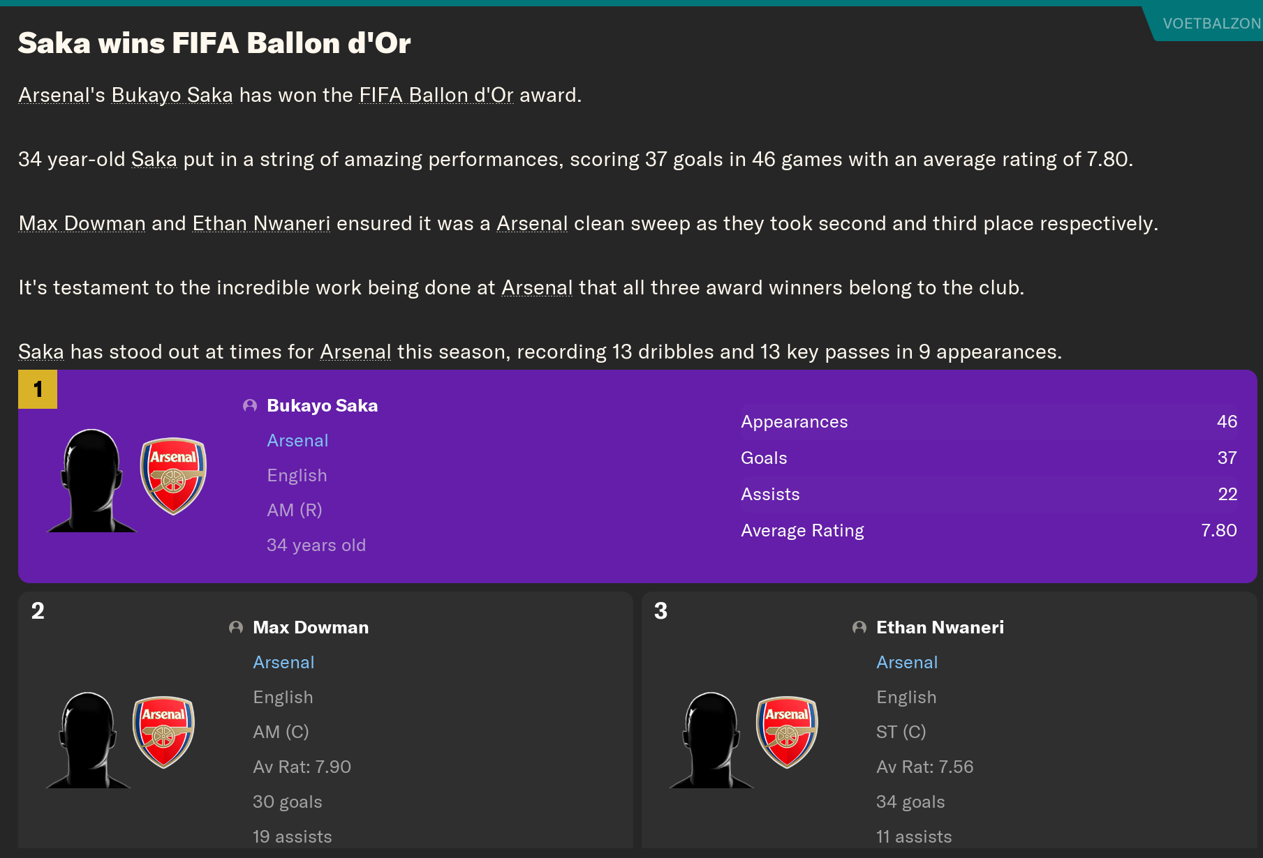 Bukayo Saka remains at an elite level, having just won his 6th Ballon d’Or but is starting to show signs of physical decline.