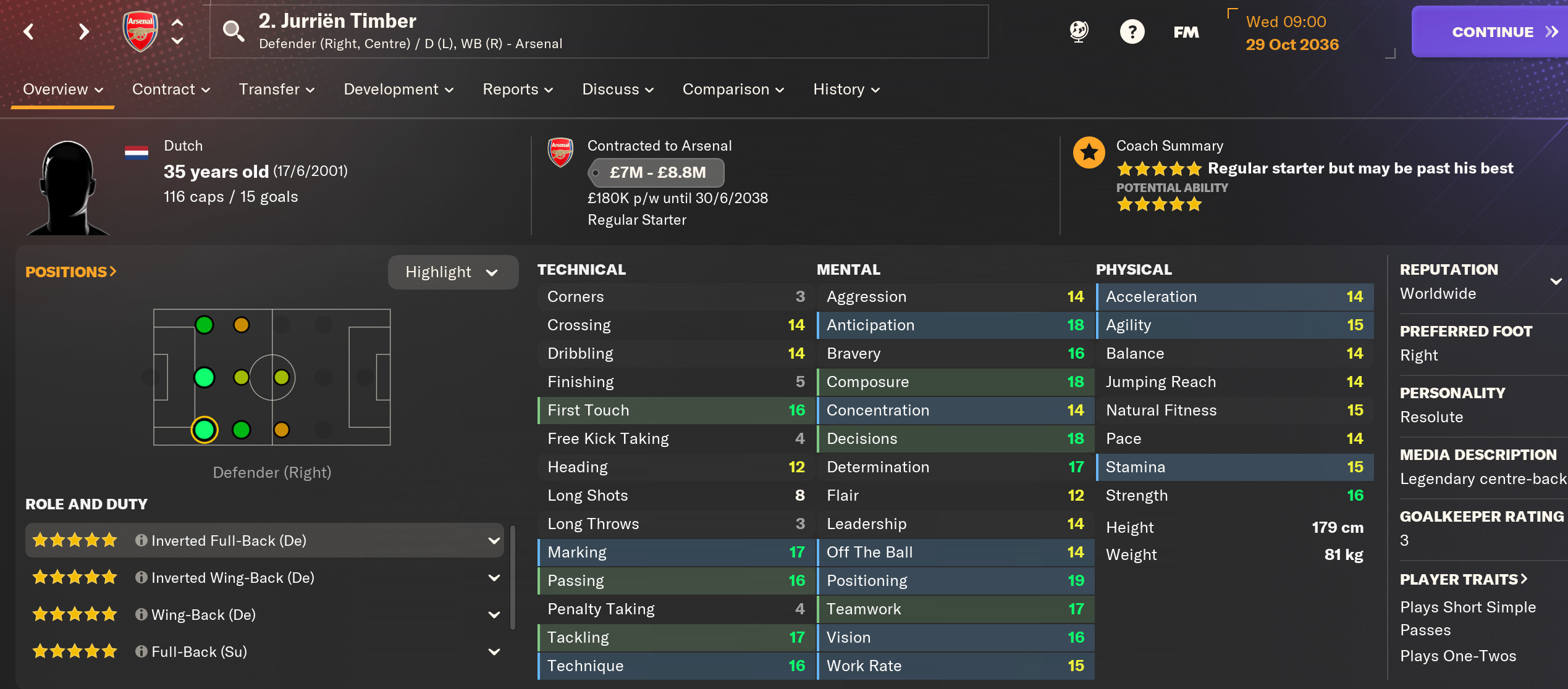 Also at 35 years old, Jurriën Timber similarly remains one of the best in the world but his physical attributes no longer reflect the marauding, all-action wingback he was during his prime years.