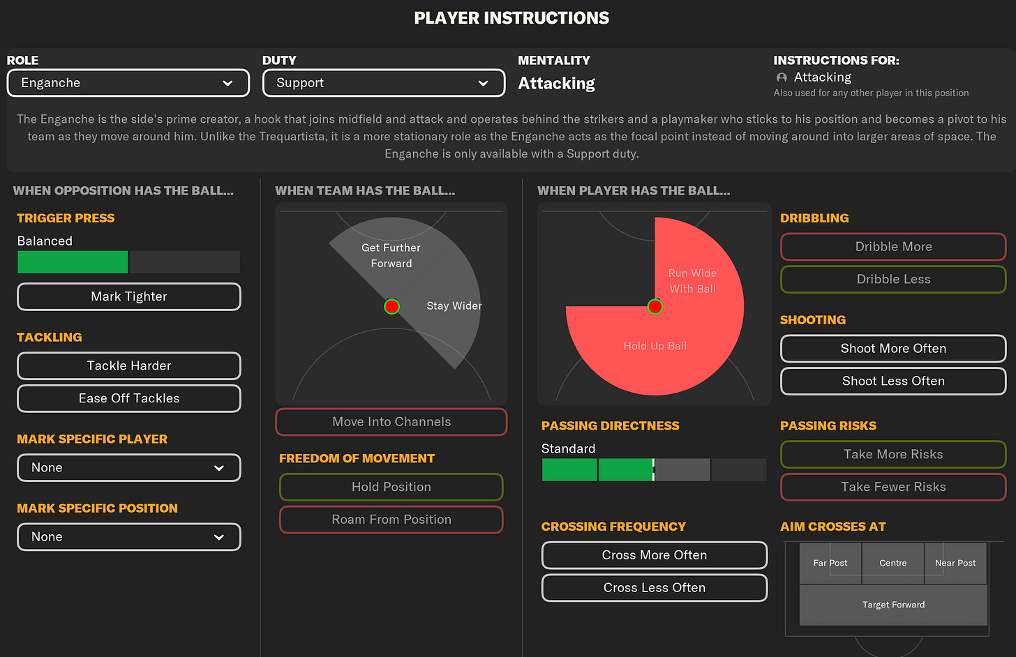 I chose Enganche (Support) as a naturally static playmaker role reflecting his aging - naturally less dynamic - and creative role connecting midfield and attack.