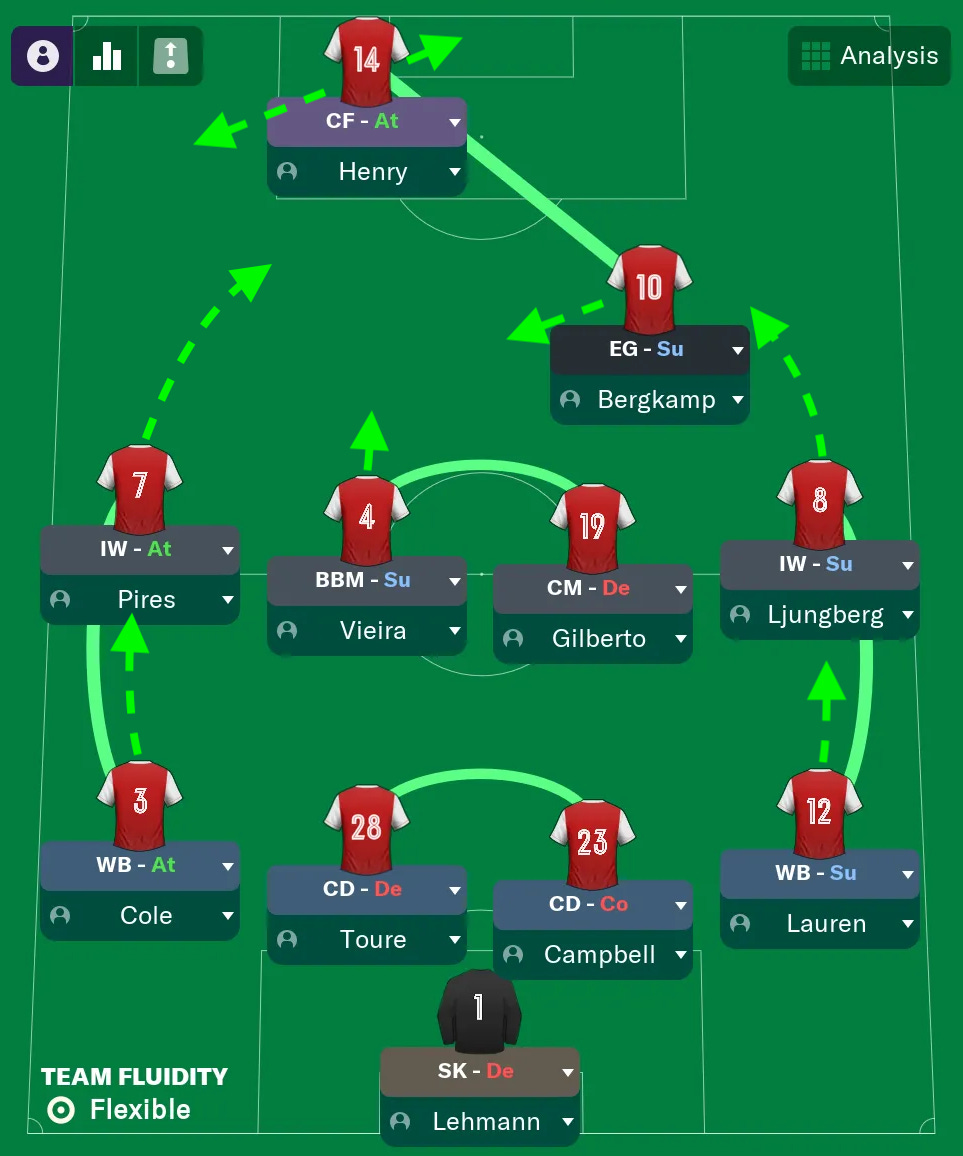 The Invincibles lined up in a fluid and expansive 4-4-2 formation, combining pace and power with elegance and artistry to produce aesthetically breathtaking football.
