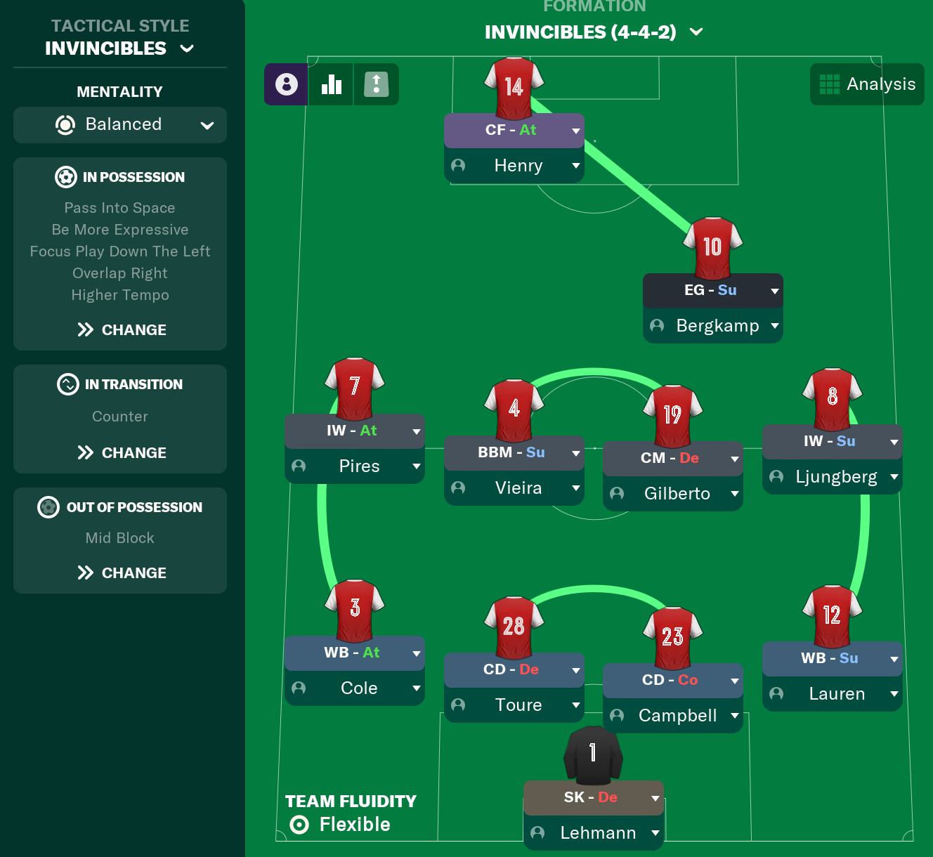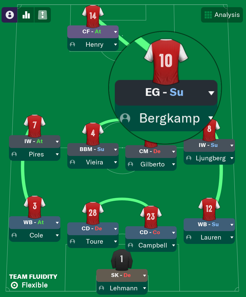 Arsène Wenger’s Invincibles can best be represented in Football Manager 2024 in a 4-4-1-1 formation with Bergkamp withdrawn, in a playmaker role.