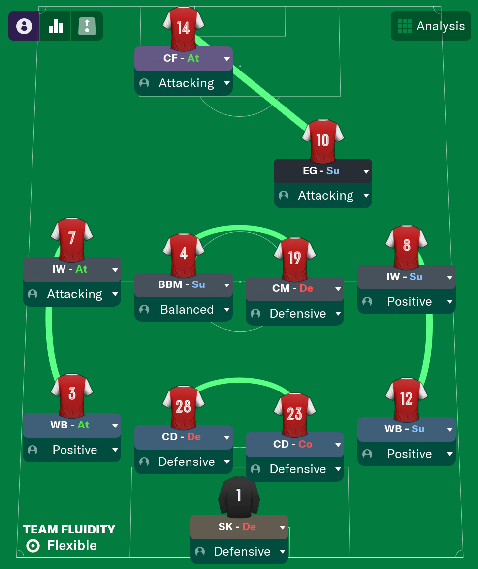 Attack duties on the left flank, and Support duties on the right flank gives us an Attacking individual mentality on the left, and Positive individual mentalities on the right, promoting that left-side bias.